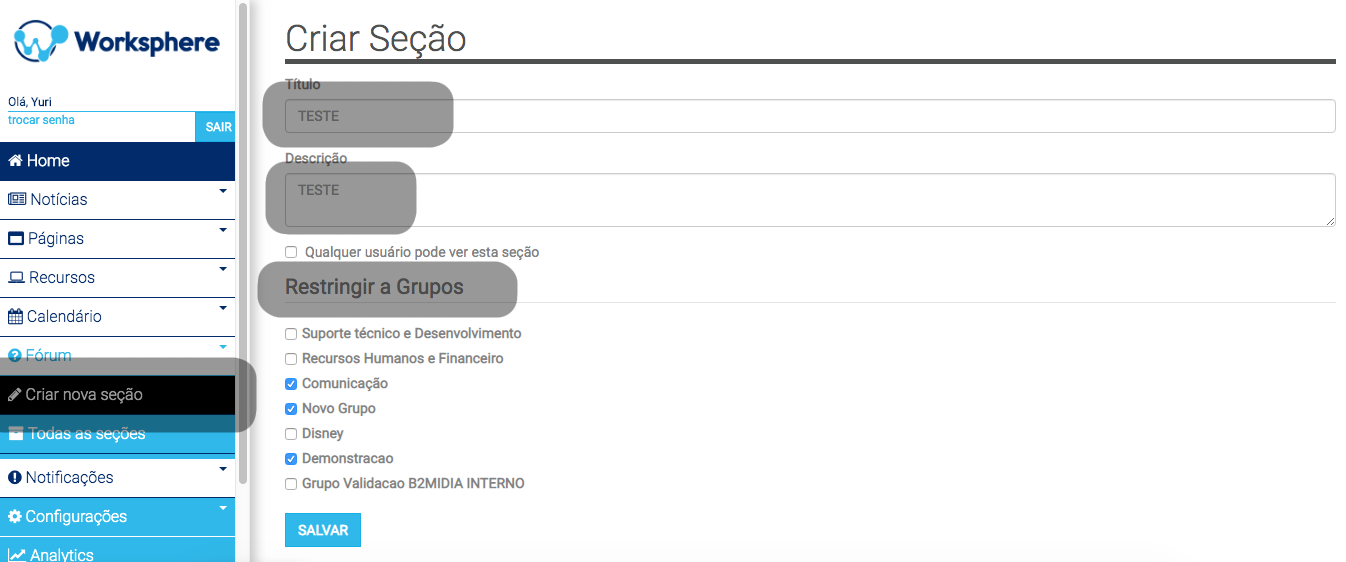 PASSO 1: Para criar uma nova seção no fórum, basta acessar a conta, no menu lateral esquerdo, clicar em Fórum e após clicar em Clicar nova seção, após isso basta preencher o Titulo, a Descrição e restringir os acessos da Seção, para grupos ou se o fórum ter que ser visível para todos os grupos, deixe selecionado a opção "Qualquer usuário pode ver esta seção".