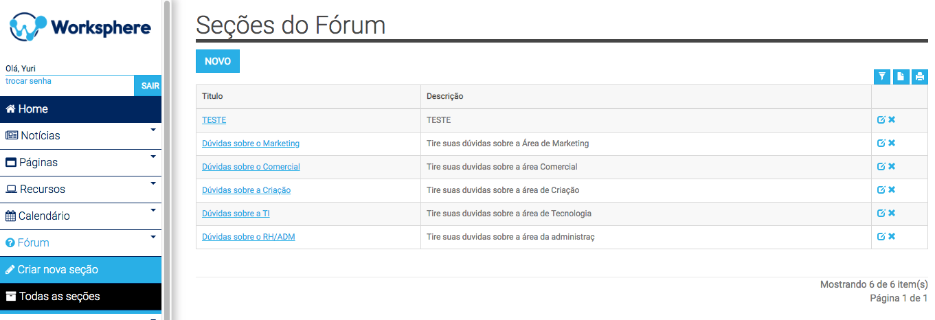 Passo 1: Clique em Fórum no canto lateral esquerdo e após isso clique em Todas as seções Repare que na pagina que irá se abrir é possível editar e excluir uma seção, basta clicar nos ícones que se encontram na barra lateral direita, para verificar os tópicos criados na seção, basta clicar em cima do nome da seção.