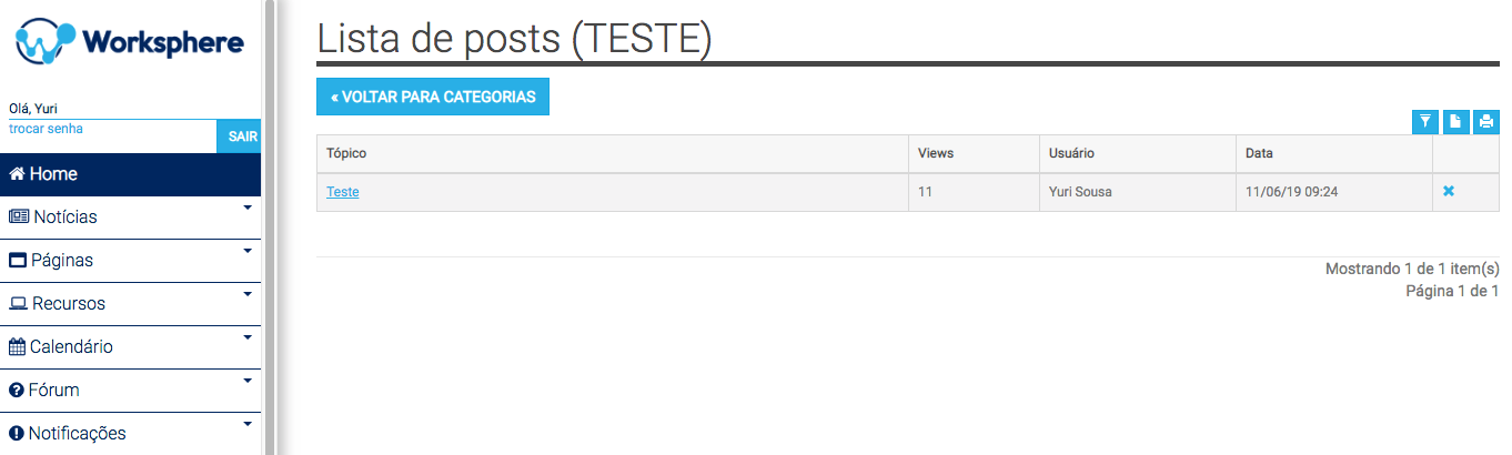 Passo 2: Agora temos uma seção disponível no aplicativo e para criar tópicos de discussão dentro de uma seção, basta clicar no menu do Fórum na lateral esquerda da aplicação e selecionar a seção desejada, neste caso iremos utilizar a seção criada TESTE.