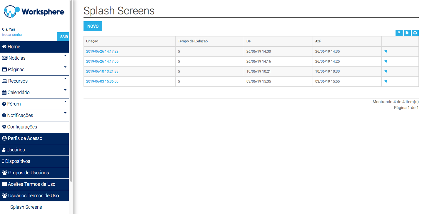 Passo 2: Para criar uma nova Splash Screen, basta clicar em "NOVO".