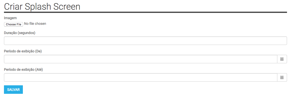 Passo 3: Basta preencher os campos necessários, como Imagem, Duração da Splash Screen e o Período de Exibição (O período de exibição não pode conflitar com outros períodos programados em outras Splashs Screen).