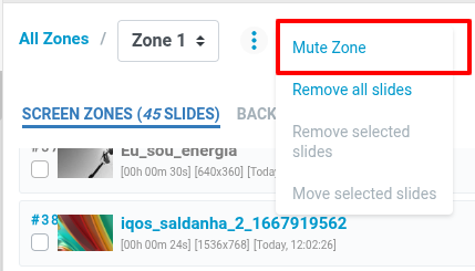 Podem fazer mute à Main Zone da Playlist de Vídeo, assim o volume de todos os slides será zerado, e todos os slides adicionados no futuro serão zerados também conforme imagem abaixo.