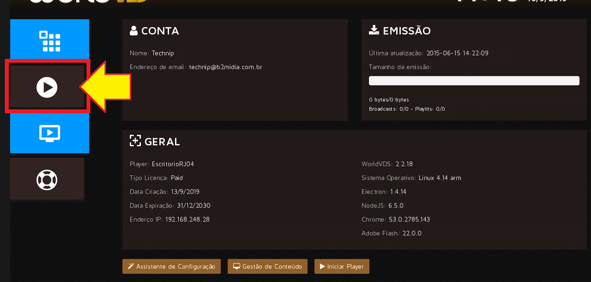 Passo 2: Feita a conexão com o TeamViewer, garanta que o WorldVDS também encontra-se devidamente conectado à internet. Para realizar estes passos, clique aqui! ou, caso seja conexão de internet cabeada, garanta que há um cabo Ethernet corretamente inserido e funcional no Player Raspberry Pi.