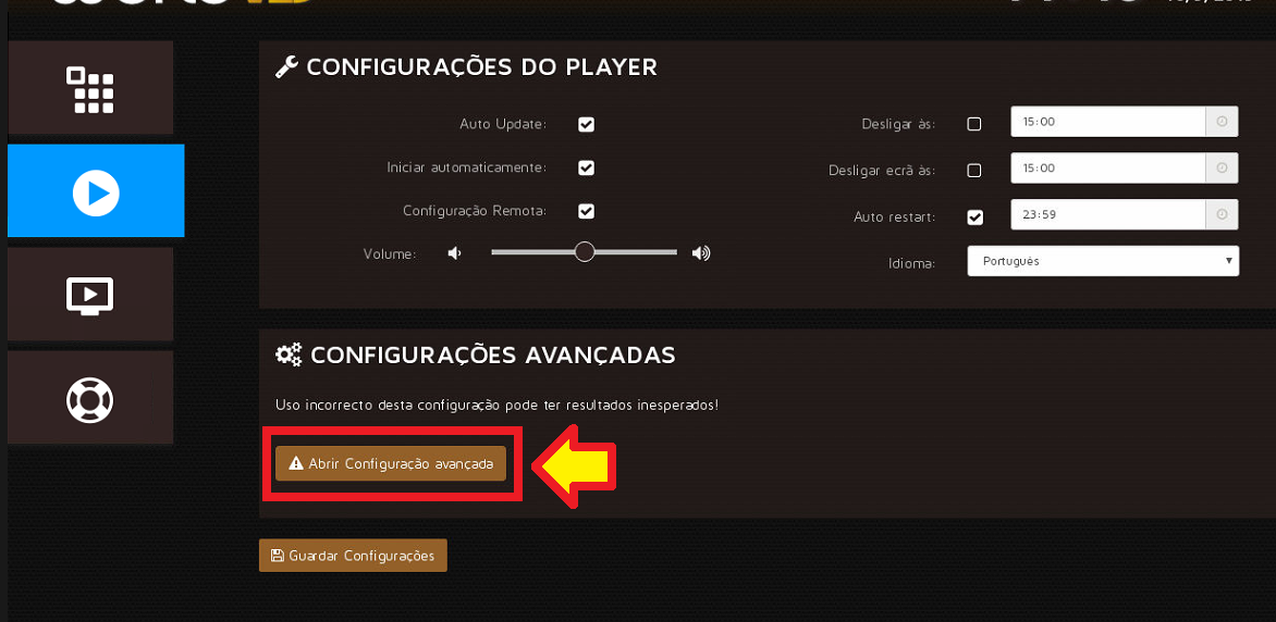 A - Passo 3: Com o VDS em execução no respectivo Player, clique com o botão direito do mouse para acionar o Menu, e logo em seguida clique sob a opção "Painel de Controlo", destacado pelo ícone de engrenagem e logo depois selecione o ícone de Player, destacado pela imagem com ícone de "Play", e depois clique no botão "Configurações avançadas".