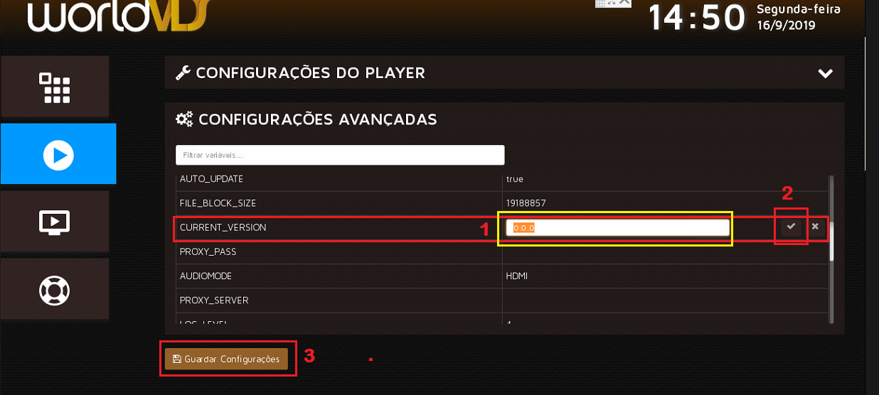 A - Passo 4: Nesta seção, identifique a variável "CURRENT_VERSION" e altere seu valor (no exemplo 2.2.18) para "0.0.0" (sem aspas) e clique para salvar/guardar as configurações realizadas. Reinicie o Player Raspberry Pi com o comando "reboot" (sem aspas) que precisa ser digitado no terminal de comandos (que pode ser acessado rapidamente com o atalho "Ctrl + Alt + T" no teclado).
