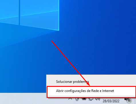 1- Clique com botão direito no ícone de redes na barra de sistemas, e em ABRIR CONFIGURAÇÔES DE REDE E INTERNET.