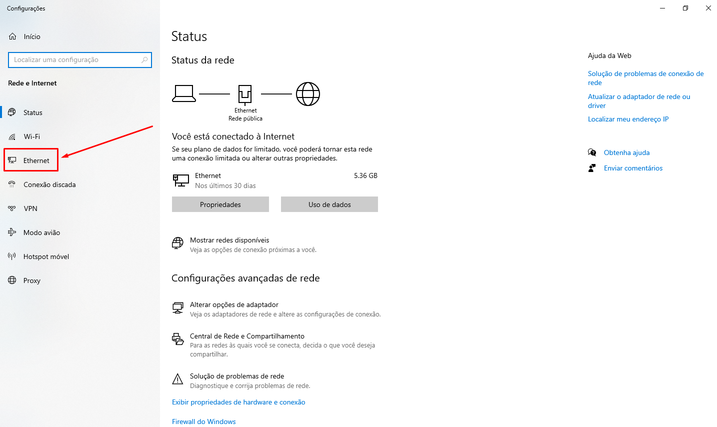 2- Na coluna da esquerda clique em ETHERNET.