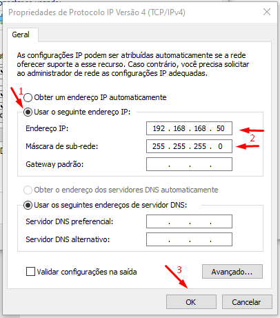 2º defina o IP dentro da range pertencente ao dispositivo TX/RX (192.168.168.X) substituindo o X por um número entre 1 e 255, excluindo do 55, este é reservado pela fabricante ao dispositivo, a mascara de sub redes 255.255.255.0 por regra é preenchida automaticamente.
