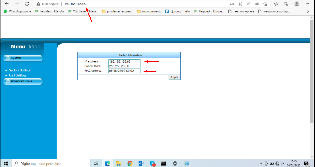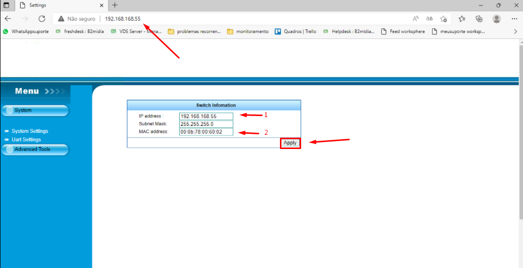 Obtendo resposta do dispositivo abra o navegador de internet e na barra de endereço acesse: **192.168.168.55**