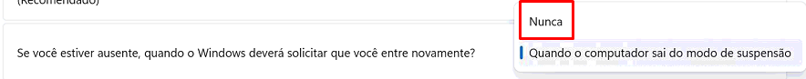 Abrindo as Opções de Entrada, role até a seção de Configurações Adicionais, e procure pela opção: "Se você estiver ausente, quando o Windwos deverá solicitar que você entre novamente?":