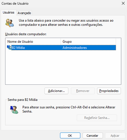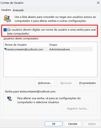 Após iniciar o windows novamente, abra o Executar do Windows (WIN+R) e abra novamente o comando NETPLWIZ.