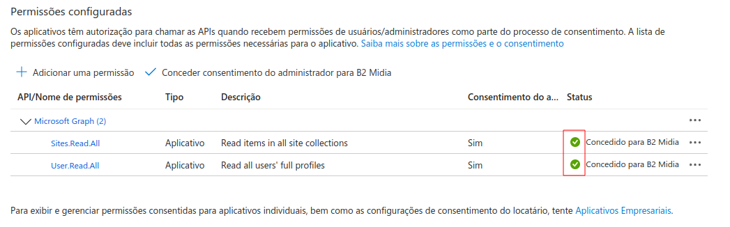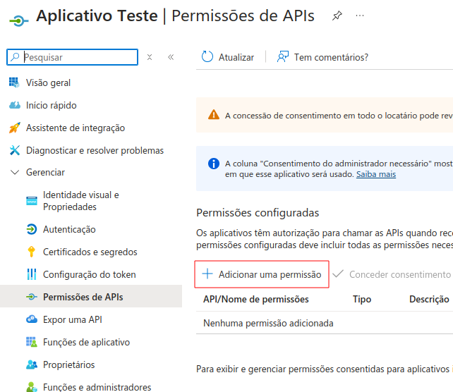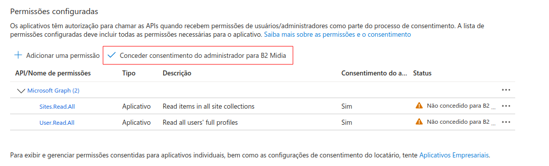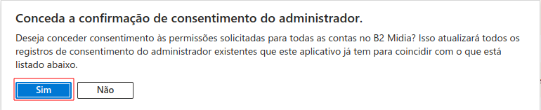 - Após adicionar as permissões, clique em Conceder consentimento do administrador para [seu diretório]e confirme.