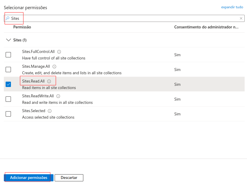 - Pesquise por Sites marque a opção Sites.Read.All e clique em Adicionar permissões.