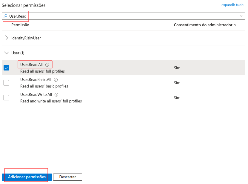 - Pesquise por User marque a opção User.Read.All e clique em Adicionar permissões
