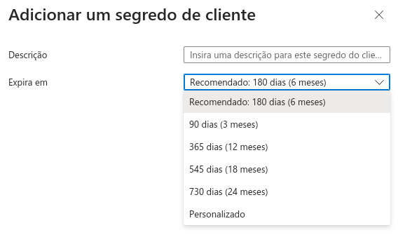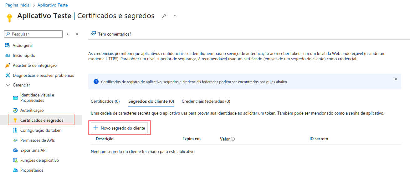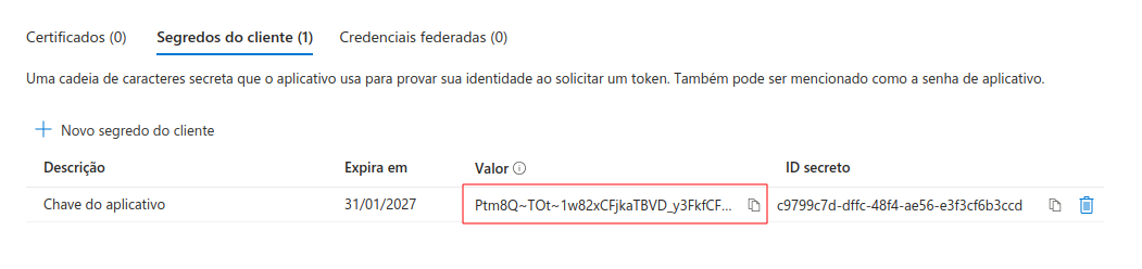 Client Secret- Após a criação, copie imediatamente o Valor do segredo, pois ele só será exibido uma vez.