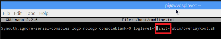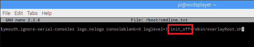 dwc_otg.lpm_enable=0 console=serial0,115200 console=tty1 root=/dev/mmcblk0p2 rootfstype=ext4 elevator=deadline fsck.repair=yes rootwait splash quiet plymouth.ignore-serial-consoles logo.nologo consoleblank=0 loglevel=1 init_off=/sbin/overlayRoot.sh