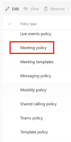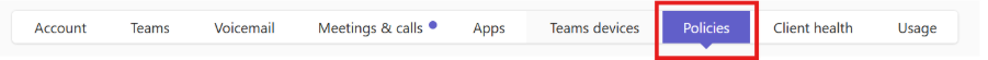 - No centro de administração do Teams, expanda Reuniões e, em seguida, selecione Políticas de reunião.