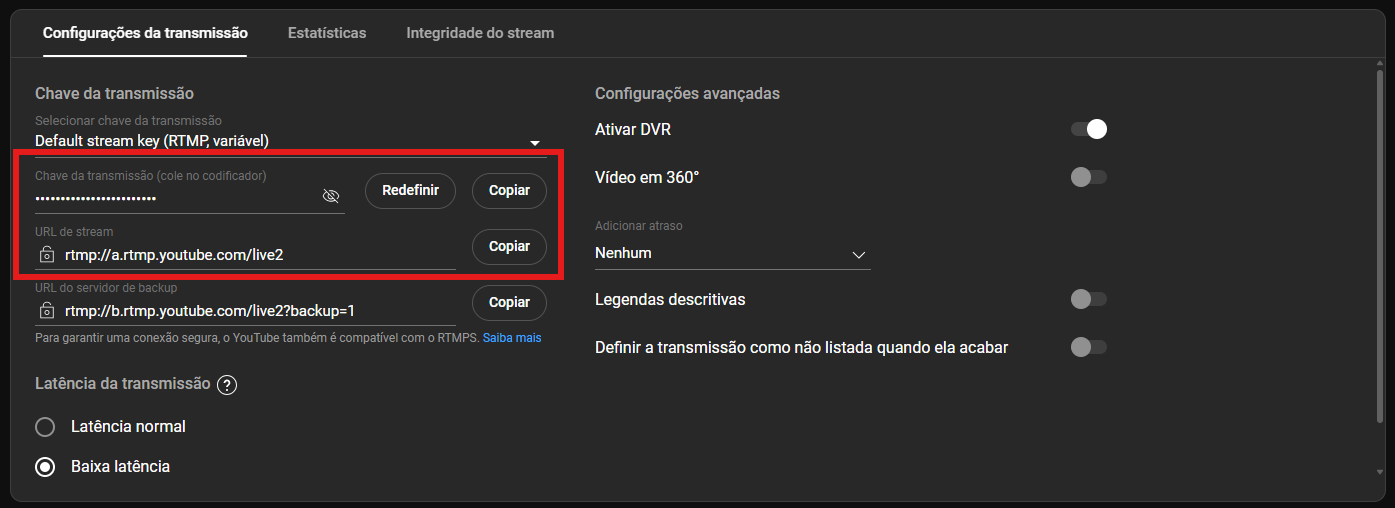 Em "configurações da transmissão, copie a URL de stream e a Chave da transmissão