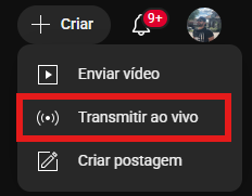 No youtube clique em criar e em sequencia, criar transmissão ao vivo