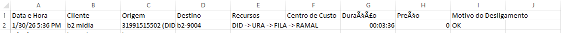 Data e Hora, Cliente, Origem, Destino, Recursos, Centro de Custo, Duração, Preço e Motivo do Desligamento.