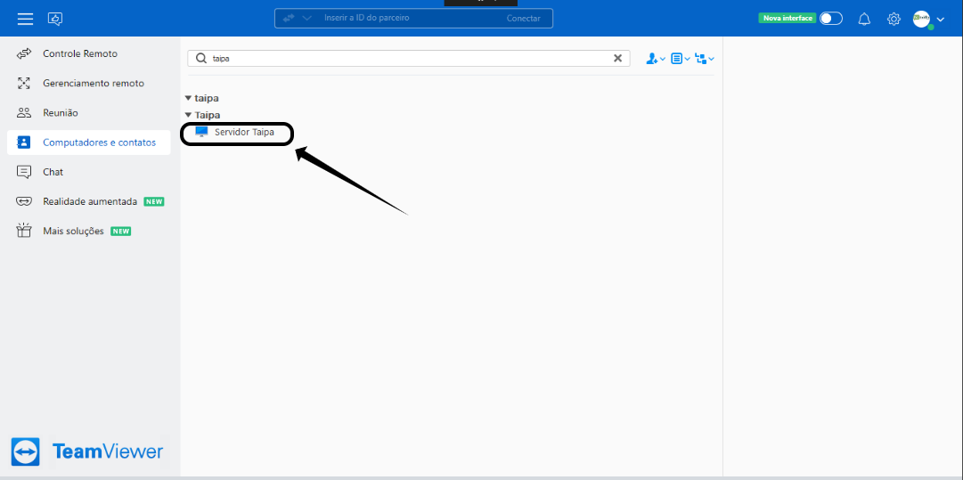 Na barra de pesquisa digite Taipa, e em seguida entre no servidor dando dois cliques em cima: