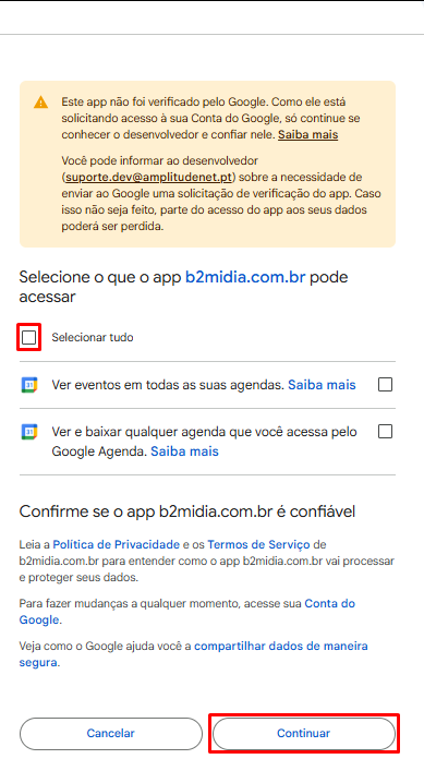 A tela abaixo será exibida, nesta etapa é necessário selecionar a caixa: Selecionar tudo, e clique em Continuar