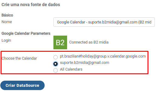 Abrirá a tela abaixo, indicando que o datasource foi criado, sendo necessário realizar apenas a seleção do calendário ao qual deverá ser exibido.